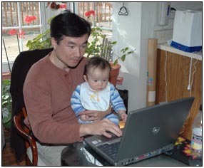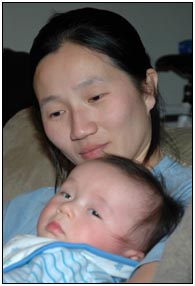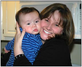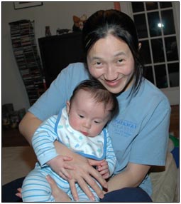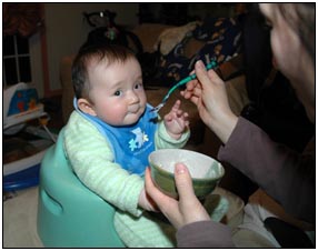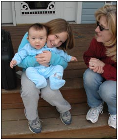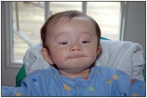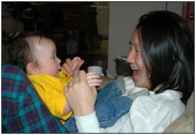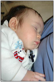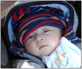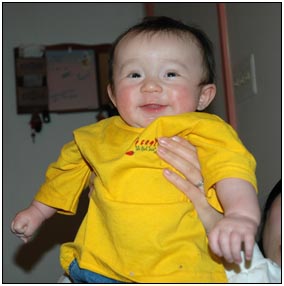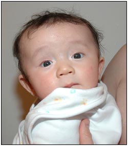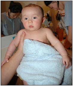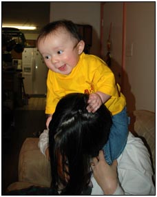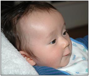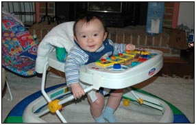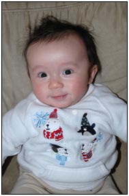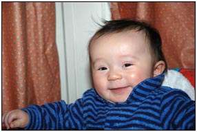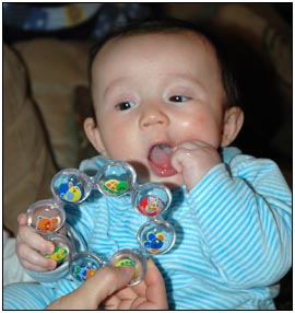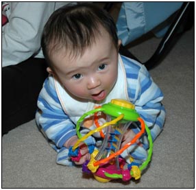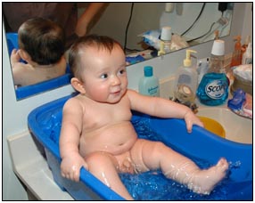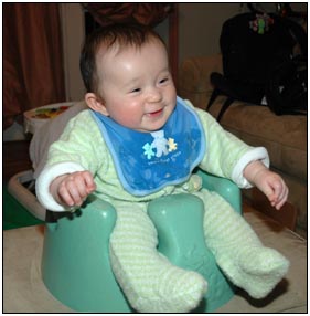 . I'm sleeping for longer through the night these days, which makes Mommy very happy and I awake each morning with a smile and sometimes a giggle or two. I'm learning that I can make many different sounds, and some of them even make me laugh out load. Bath time is a fun time for me right now because I can kick my feet and splash water all around, sometimes I get Mom or Dad, but they don't mind too much.