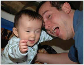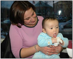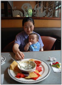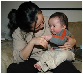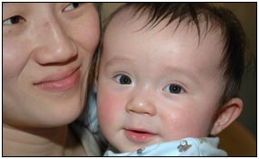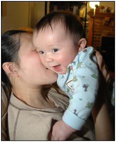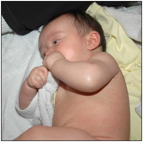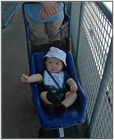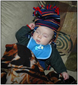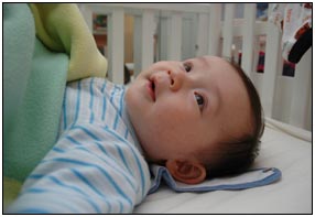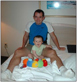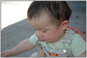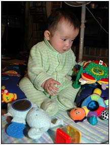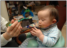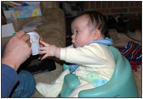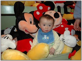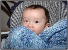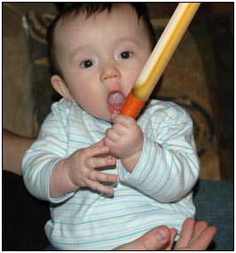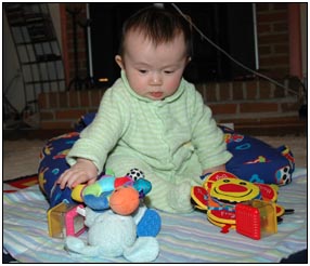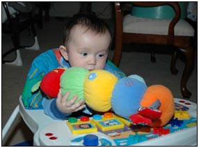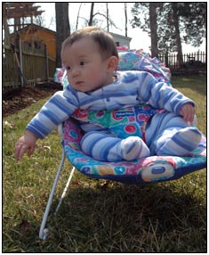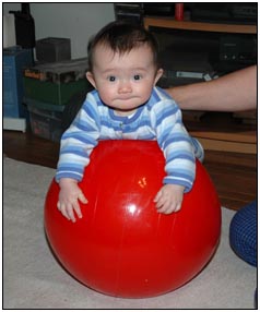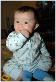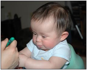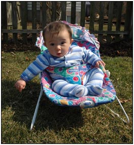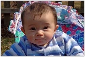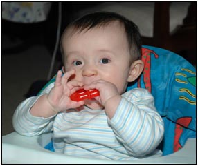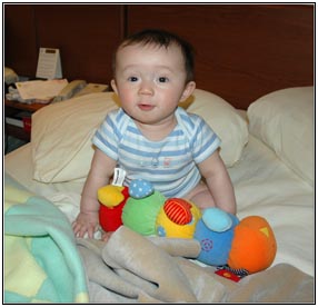 Well I finally reached the tender age of a half, seems like just yesterday that I was squeezed into the world, and now I'm all grown up, well nearly. This has been an exciting yet painful month for me. As I looked out of the window and saw winter turn to spring, little did I know that a special part of spring was taking place right here in my mouth. I now have one little (felt big coming through) sharp pearly white tooth, I'm very proud. I was taken on a mini excursion to Orlando this month, which was good fun, although I think that Mom and Dad need to plan a bit better for our next trip in May. I have always been a creature of habit and yet transitioning from milk to baby food this month was a breeze, I like most flavors and take pleasure in getting them all over the place.