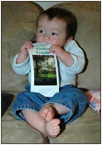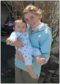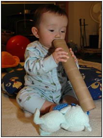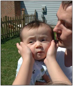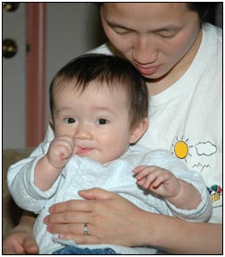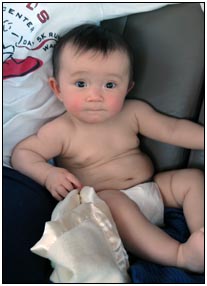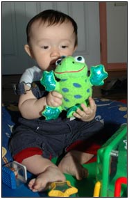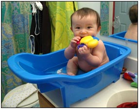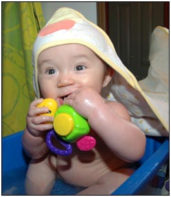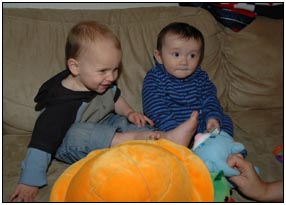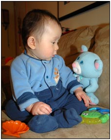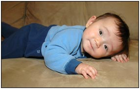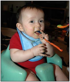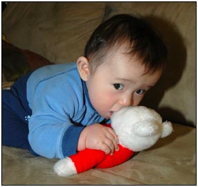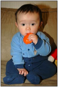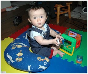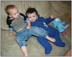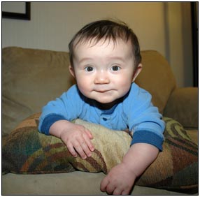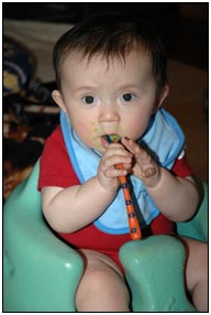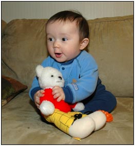Low and behold this month I developed yet another tooth, which brings my total count to a grand total of two. My baby super skills now include sitting, grabbing stuff, leaning over to reach, sleeping on my side, eating like there's no tomorrow, holding my own bottle to feed myself, giggling like a little girl, and getting whatever I want with a smile. I thought for a while this month that Mom and Dad had produced a baby brother for me. It turned out that it was my cousin Joshua who came over from England to see me; he has a bit of an accent when he says some things like 'buuurrrddddd' but not when he cries.